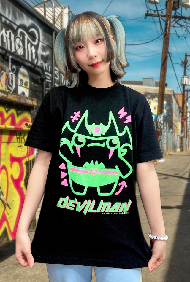 大阪梅田の大丸と東京上野の松坂屋行われた永井豪エキスポにて発売されたTシャツです。 CO2のタッチで描かれたかわいいデビルマンが蛍光塗料で描かれてます。 着用モデルはお布団天国さんです。 数量限定の商品となります。